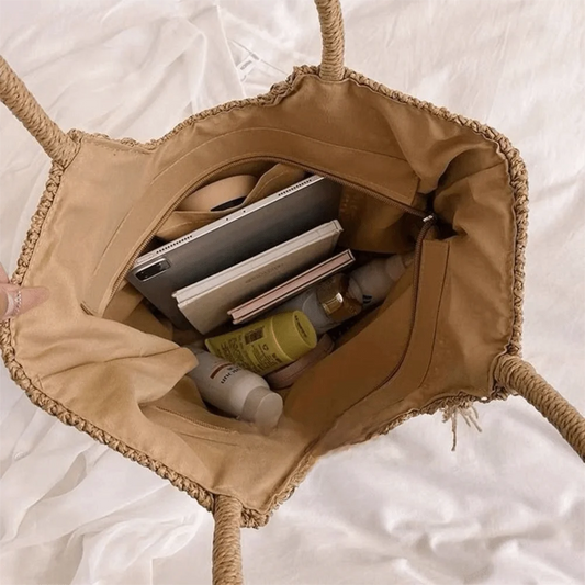 Bolso tejido de paja con Borlas – Tote Grande y Ligero para Viajes y Verano