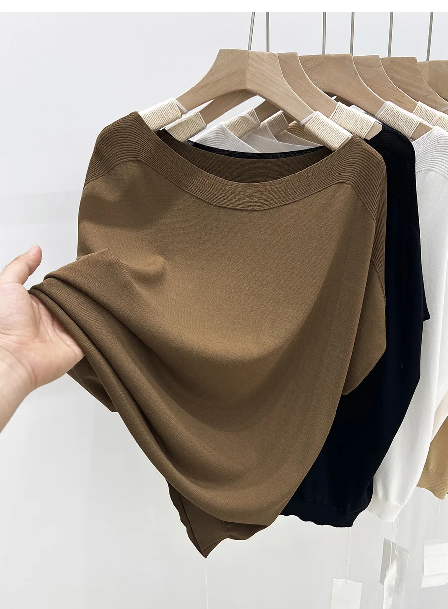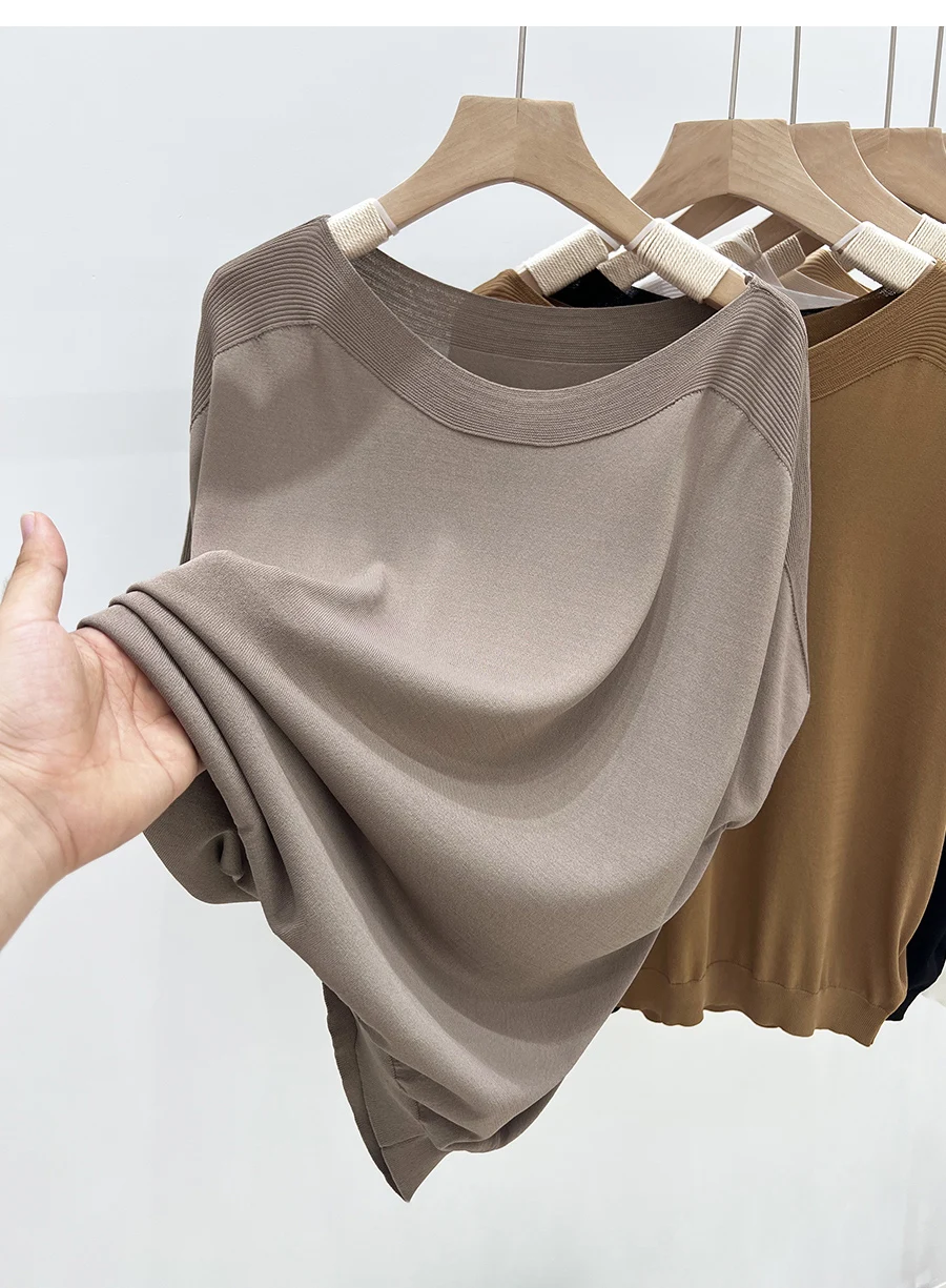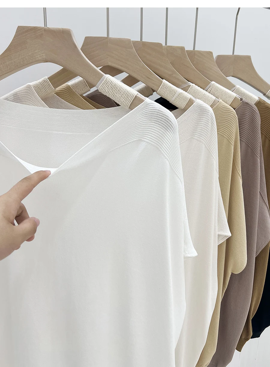 Camiseta Mujer Talla Plus de Un Hombro en Punto Ice Silk – Estilo Fresco y Sofisticado