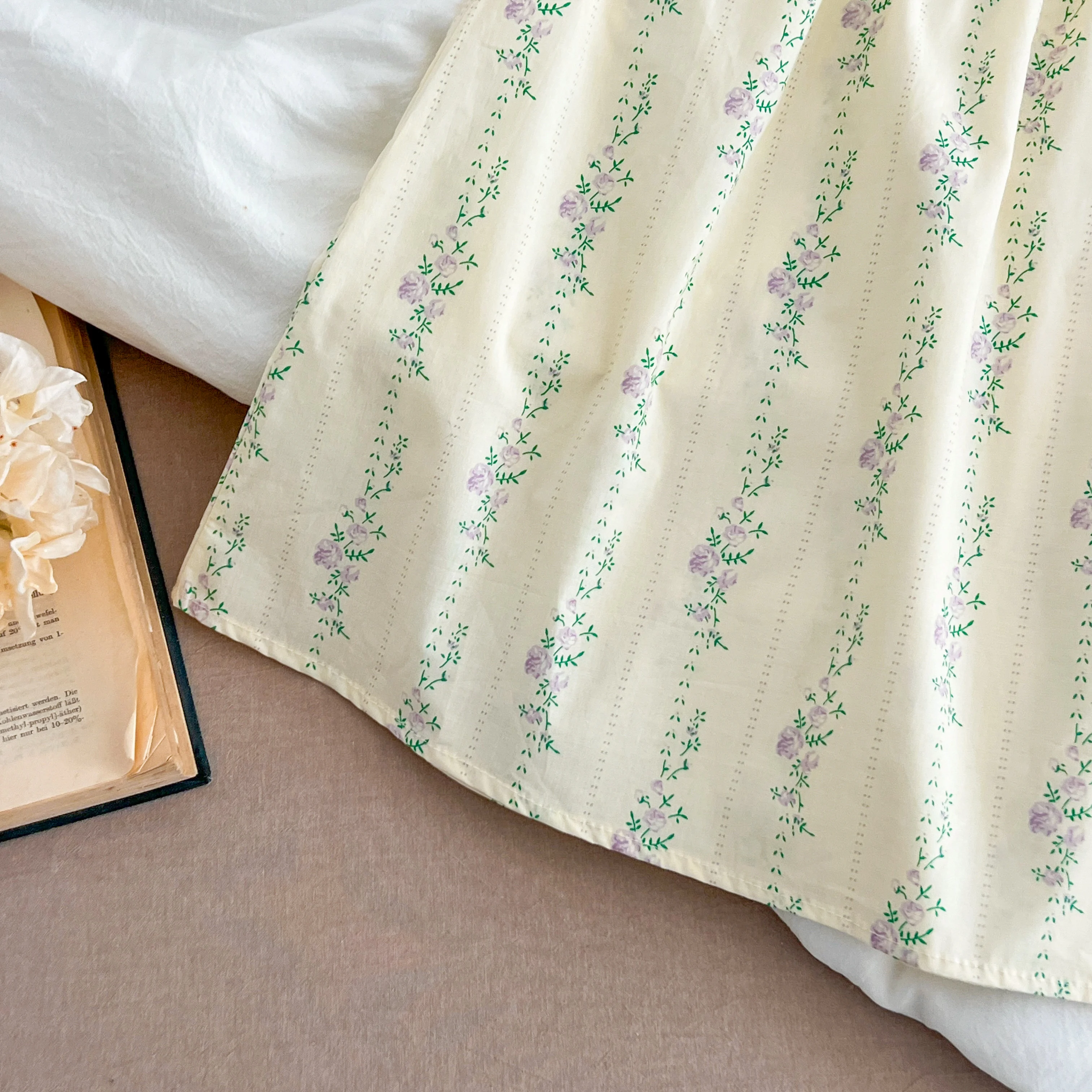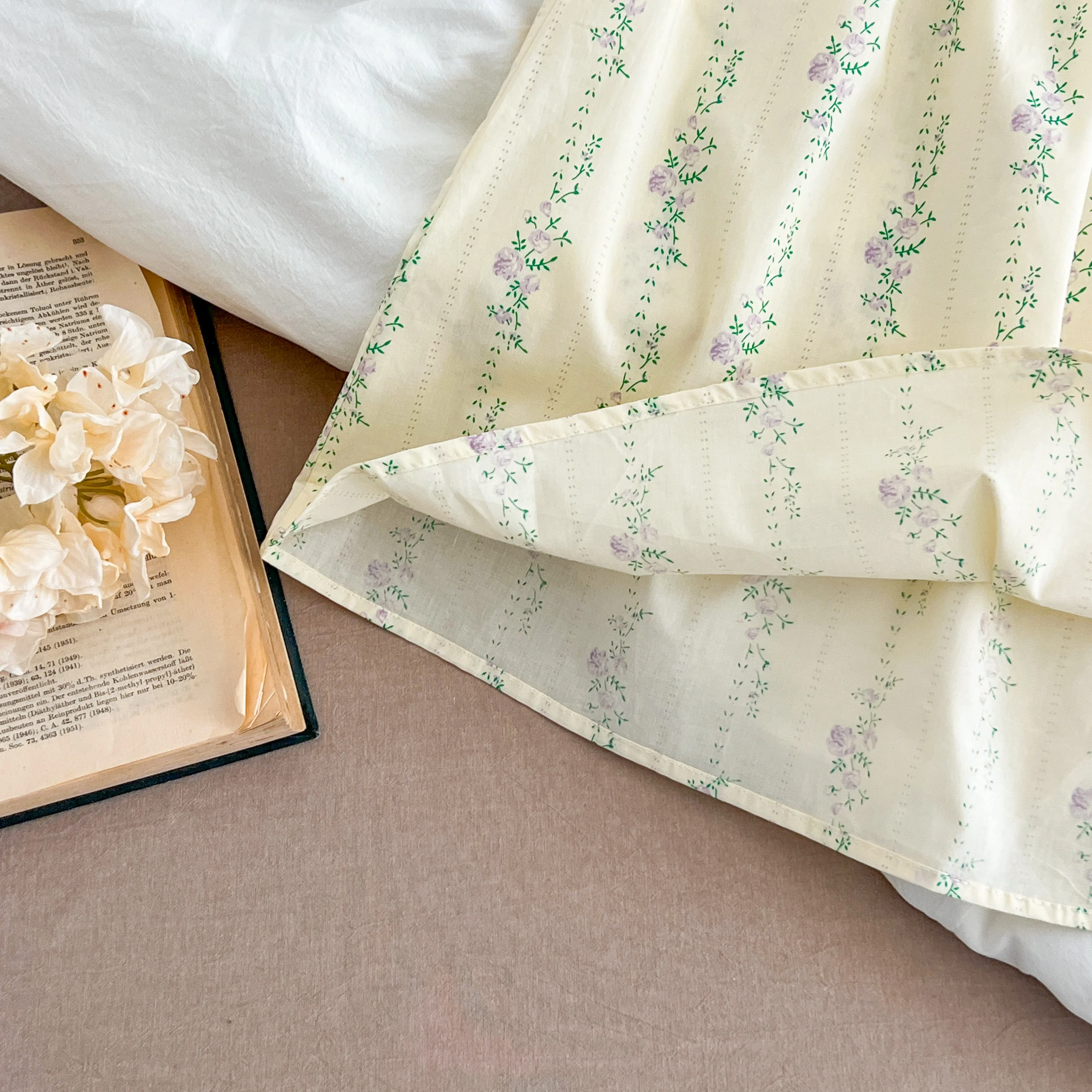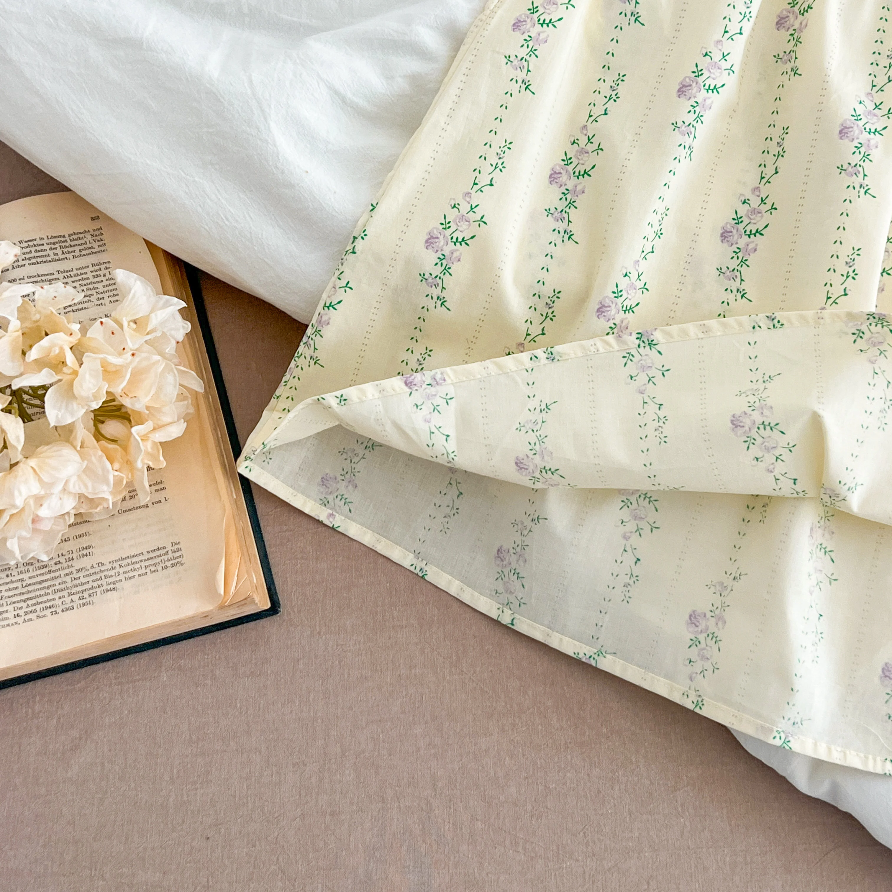 - Diseño veraniego con estampado floral suave y tonos morados.